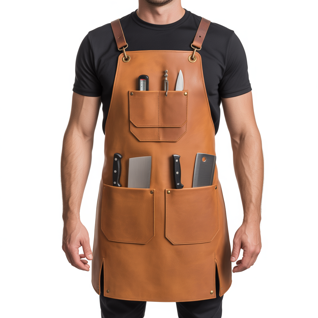 The leather’s natural resistance to splashes and cuts, combined with brass rivets and reinforced stitching that secure stress points for long-term wear, provides unmatched protection. Efficiency in workflow is achieved with the quick-access knife pockets. Your tools, blades, thermometers, and gear are all within reach.