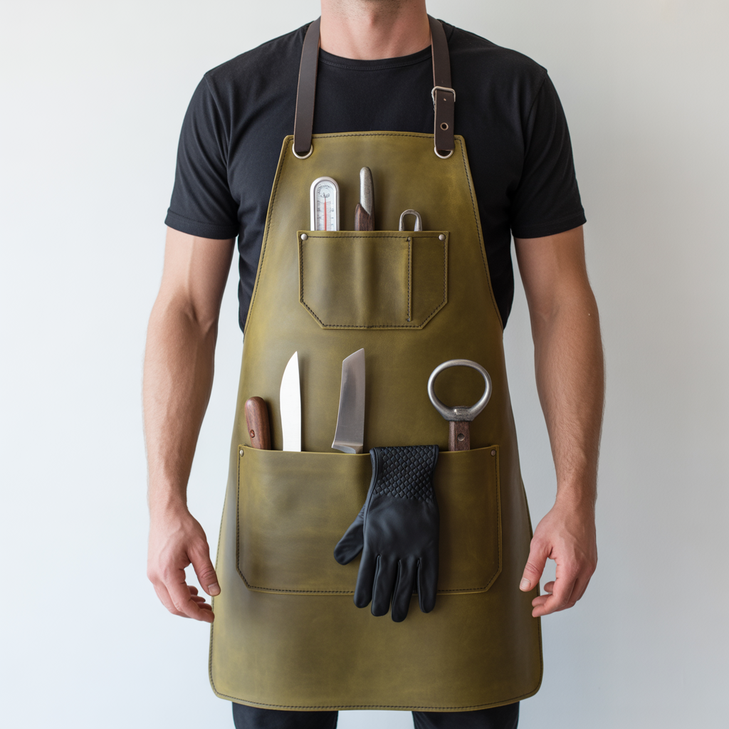 The Olive Edge Score Butcher Leather Apron is crafted for professional butchers, chefs, and culinary experts who demand durability, functionality, and style. This leather butcher apron is a great fit for trimming, slicing, or portioning since it shields the user from splashes, knife slips, and a dirty heap of food. The sophisticated leather is timeless and tough, while olive edge detailing emphasizes the apron’s centrepiece and provides practical cover.